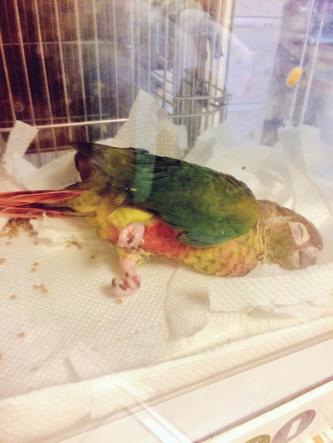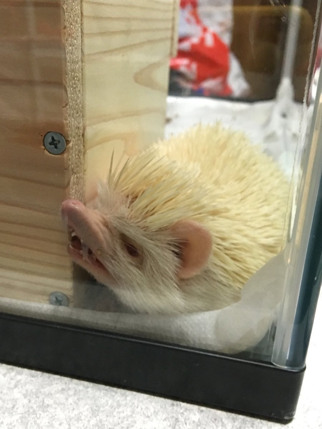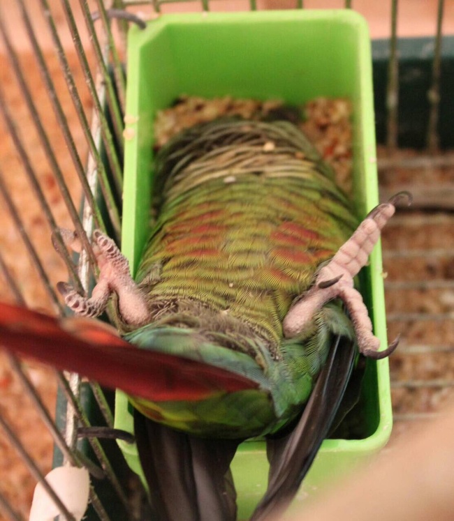 “This male lizard is holding on to the top of the cage so the female can sleep on him.”