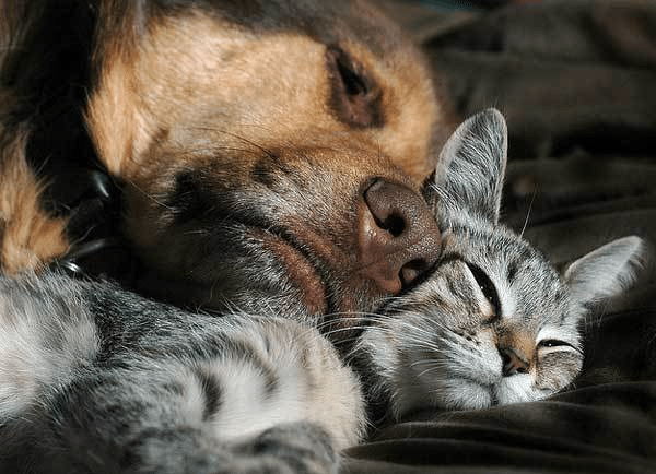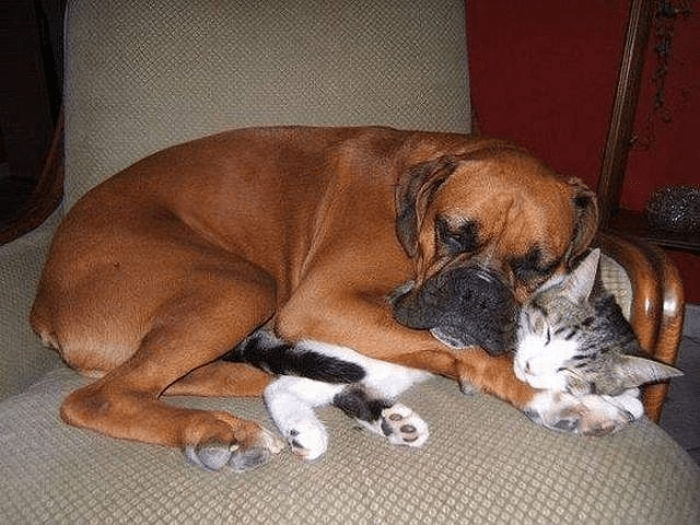 Obviously, this cat doesn’t mind the big squeezing his canine friend is giving him.