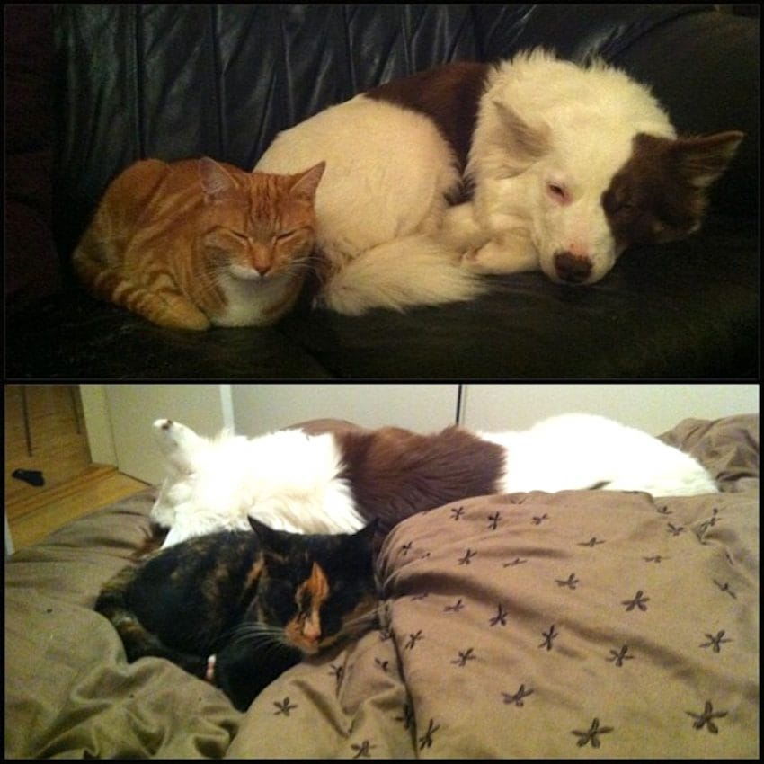 This lucky dog has two different cats to nap with. Both cats love cuddling next to the fluffy pup.