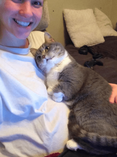 This cat is so in love with his owner! Maybe it has something to do with the fact that she is pregnant. He can sense that she is making another human for him to smother in affection.