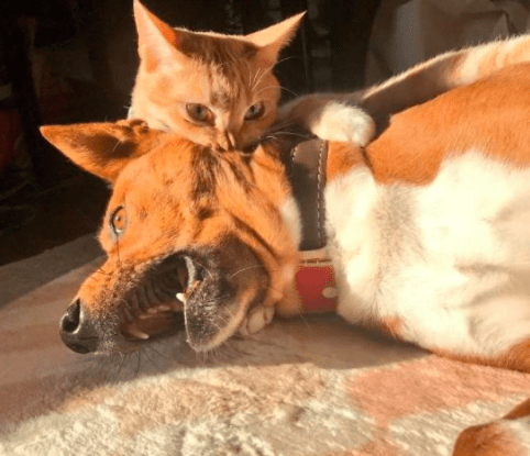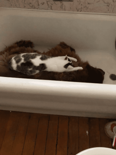 This dog loves laying in the tub! And what’s more? This cat loves laying on her canine companion! How hilarious!
