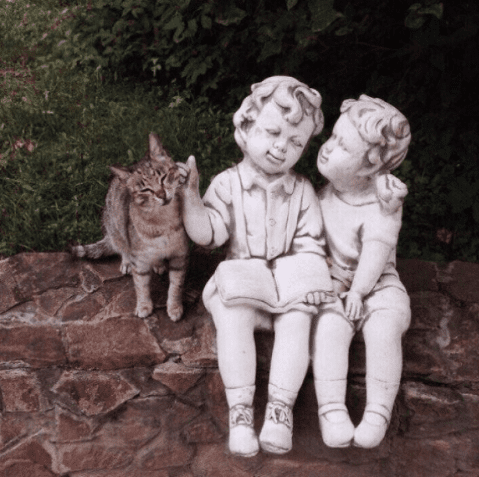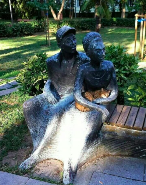 When it comes to affection, this cat has learned to take what she can get. So what if the statue’s hands are cold? Love is love!