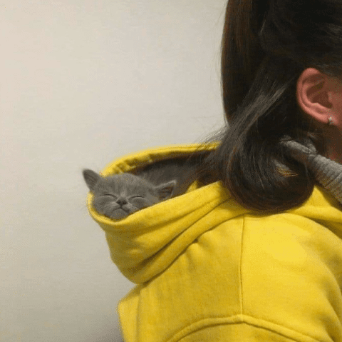 This cat looks so cozy! They always seem to find the weirdest places to sleep. Still, I would love to walk around with a kitten in my hood!