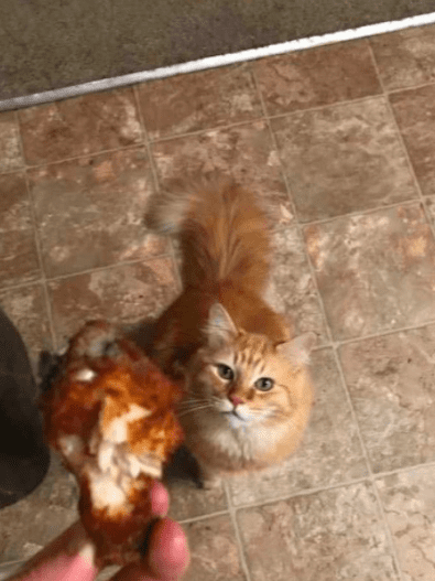 This cat baffled his human by bringing him a chicken wing from outside THAT WAS STILL WARM. Whose food did you steal, you evil genius??