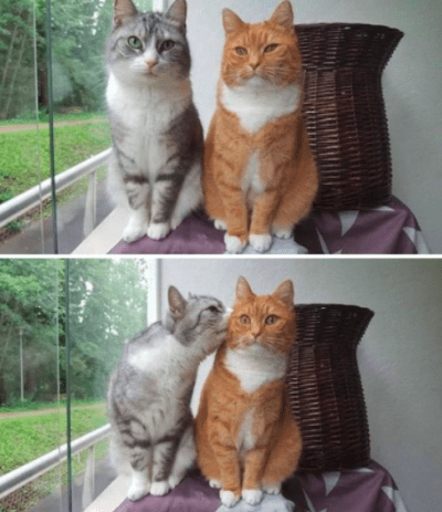 This cat had a lot of love to give, and his friend was NOT expecting it! Look at those startled eyes! This is so funny.