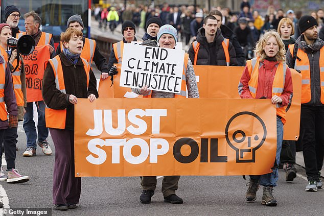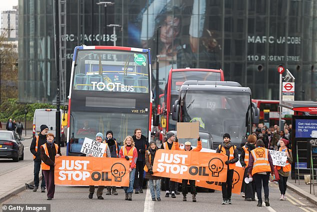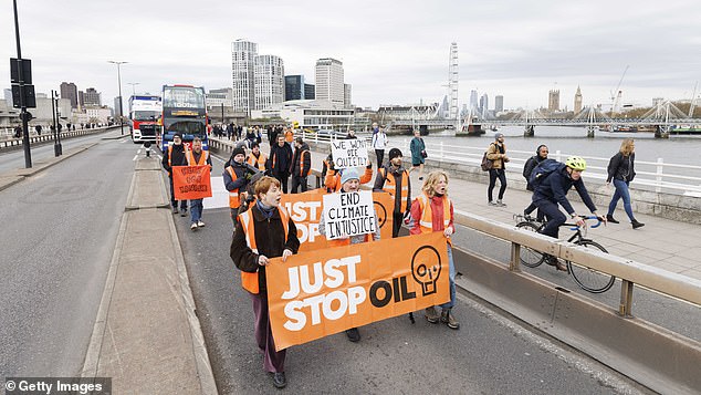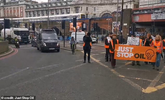 The eco-warriors could be seen donning their high-vis jackets in orange as they slowly began to march throughout central London for the third consecutive day.