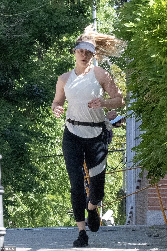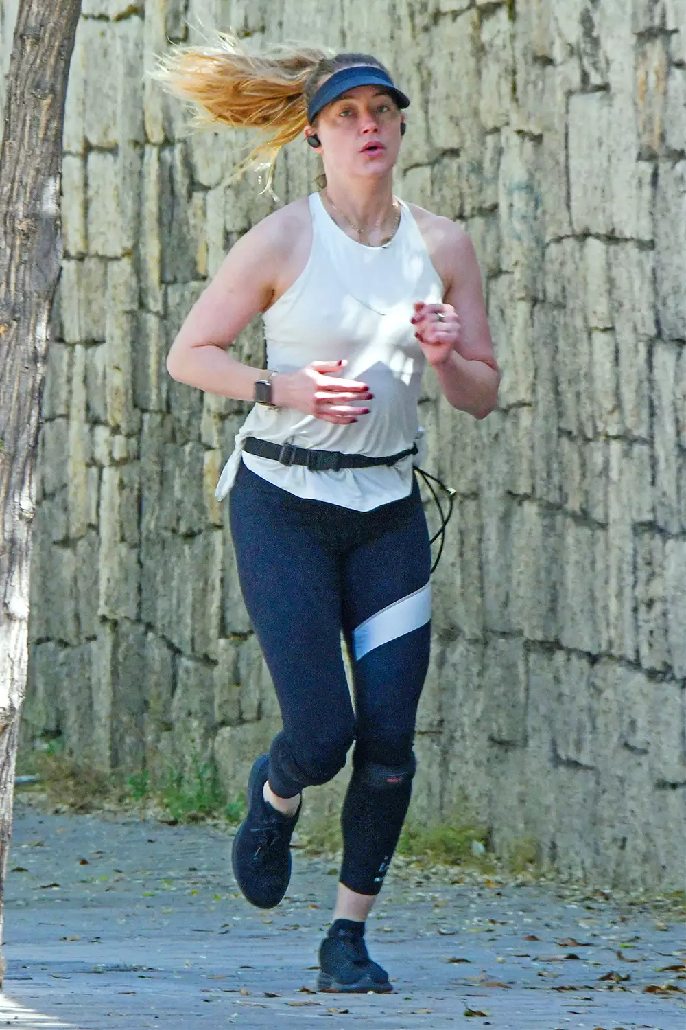 Heard opted for a pair of black leggings that paired well with her white toned tanktop and black-colored joggers. This came paired with a black toned visor.